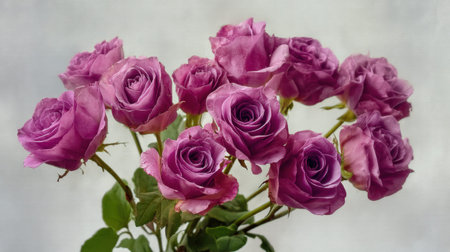 A stunning arrangement of purple roses in full bloom captured against a soft gray background, perfect for adding elegance and romance to any project or occasion.
