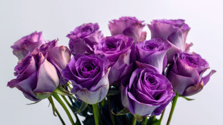 A stunning bouquet of fresh purple roses stands beautifully against a soft white background, perfect for conveying elegance, beauty, and romance in any setting.