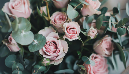 A stunning close-up view of soft pink roses elegantly arranged, conveying feelings of love and tranquility, perfect for celebrations or floral art themes.