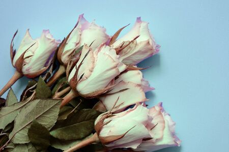 White roses on a blue background close up. Top view