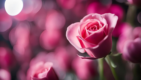 A close-up of a pink rose in a bouquet, with a soft background of blurred pink roses and bokeh lights.