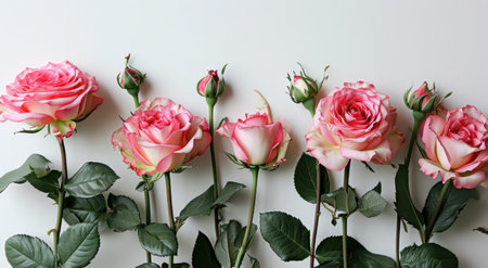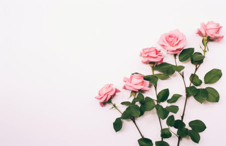 Pink roses with buds and green leaves arranged in frame on white background with copy space, floral flat lay with empty space. Wedding and romantic concepts. generation.