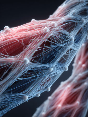Macro 3D render reveals the complex architecture of muscle fibers with a focus on texture and coloration amidst a blurred backdrop emphasizing detail.