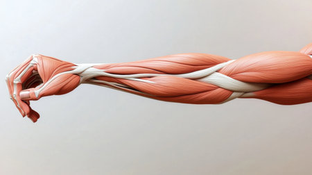 Intricate depiction of the arm's muscular structure, showcasing muscle fibers and their arrangement, ideal for educational and medical reference in anatomy and physiology.