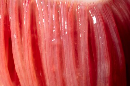An intricate close-up reveals the textured surface of a red and white muscle, highlighting its detailed features and colors.