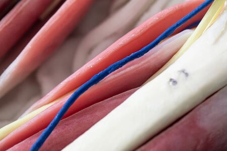 This close-up showcases the striking details of a red and white muscle, revealing its complex structure and unique fiber arrangement.