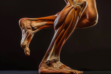 A close up of a leg with the muscles and bones clearly visible. The leg is shown in a 3D model, which gives a sense of depth and realism. Concept of strength and power, as the muscles