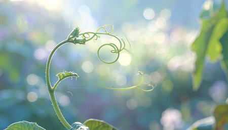 Close-up of a young plant tendril with a spiral shape, illuminated by sunlight, showcasing the beauty of nature.