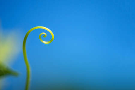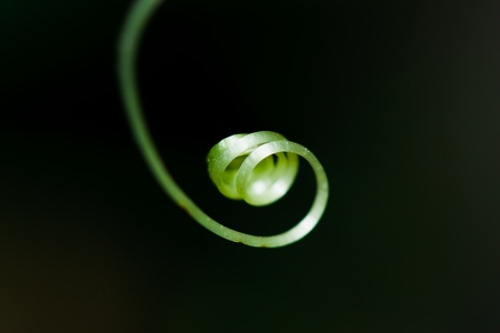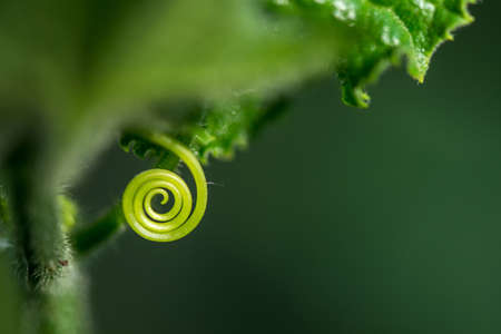 A young sprout of a cucumber vine with a mustache, a beautiful spiral along the golden ratio.