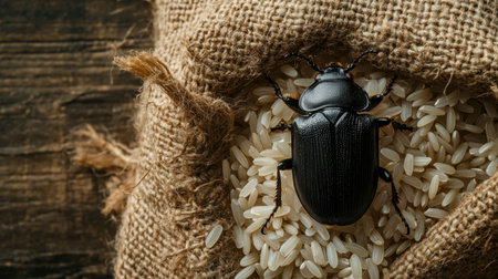 A detailed close-up of a black beetle resting on rice grains inside a burlap sack. This image depicts the intersection of nature and food storage, showcasing pest issues in agriculture.