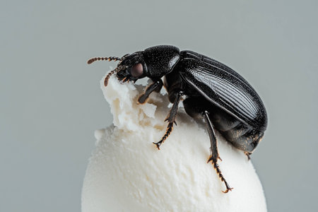 Unusual dessert concept featuring a glossy black beetle sitting atop a creamy vanilla ice cream, creating a striking contrast in textures and colors