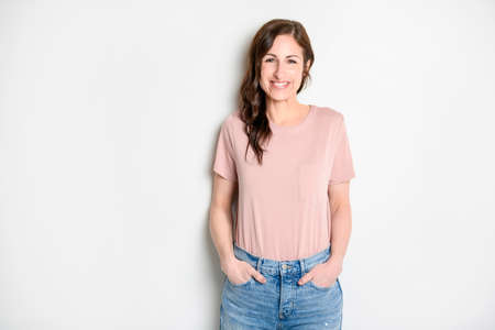 Happy carefree woman with joyful expression, smiling while standing in relaxed pose against white background