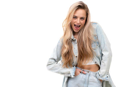 cheerful blonde on a white background with open mouth smiles and looks at the camera