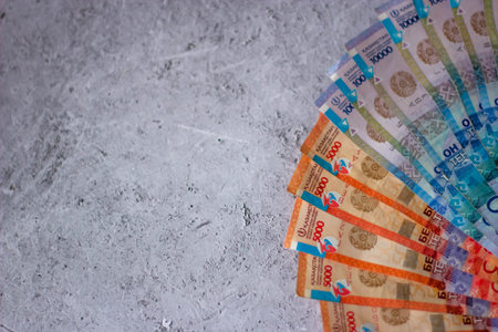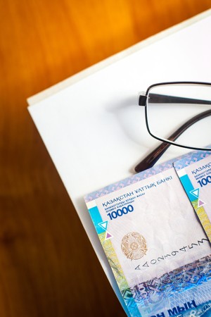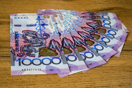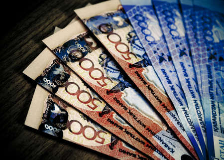 Money of Kazakhstan, banknotes tenge, large denominations for a wooden table