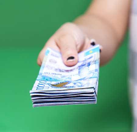 Kazakhstan money tens of thousands of banknotes in the hands of a girl, isolated on a green background