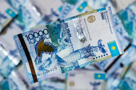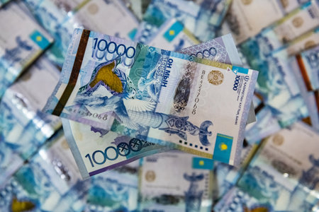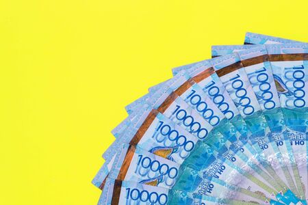 Tenge spread bills denominated at ten thousand. Yellow background.