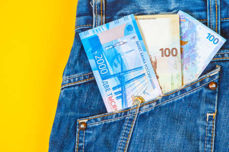 New money in Russia. A banknote of two thousand rubles. Money is sticking out of your pocket. Russian banknotes of a new pattern.