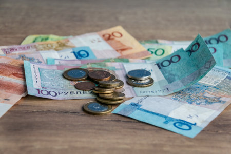 Belarusian paper money and coins on a wooden background close-up. Belarusian currency. cash. Banknotes of the Republic of Belarus.