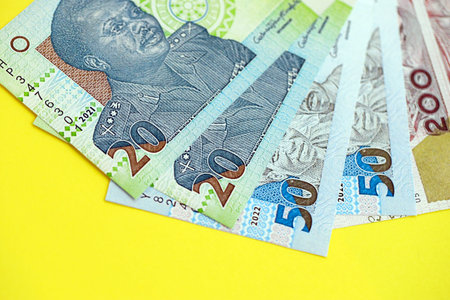 Thai baht money bills in big amount on yellow close up. Finance and banking concept