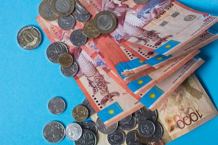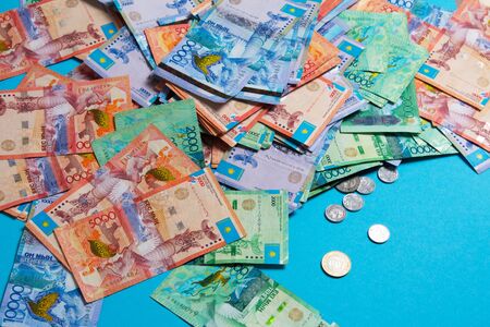 Tenge KZT on blue background. Banknotes tenge. Money Kazakhstan Tenge
