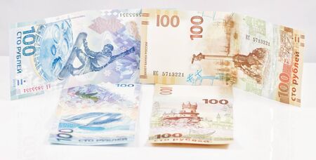 New design of money in Russia. A new bill of 100 rubles. Money of Russia on a background of yellow. New banknotes of a hundred rubles.