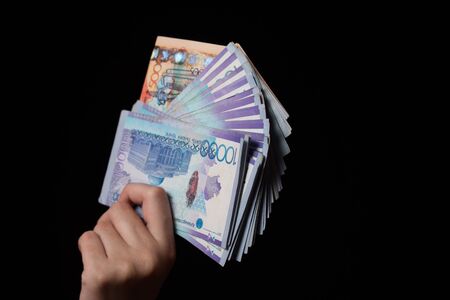Tenge on black background. Kazakh money. Banknotes tenge. Money Kazakhstan Tenge
