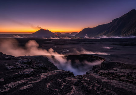 Desolate volcanic plain covered in dark ash and rugged rock, featuring powerful geothermal steam vents rising into the dramatic twilight sky. a distant active volcano glows on the horizon.