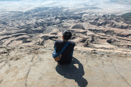 Man on top of Layer Volcanic ash as sand ground of Mount Bromo volcano (Gunung Bromo) at Bromo Tengger Semeru National Park, East Java, Indonesia.