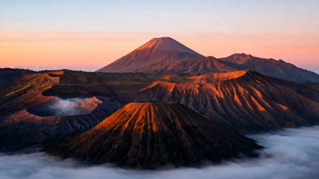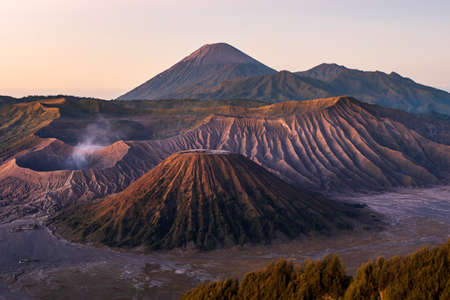 Stunning view of the Mount Bromo, Mount Batok and Mount Semeru during sunrise. Mount Bromo is an active volcano and one of the most visited tourist attractions in East Java, Indonesia.