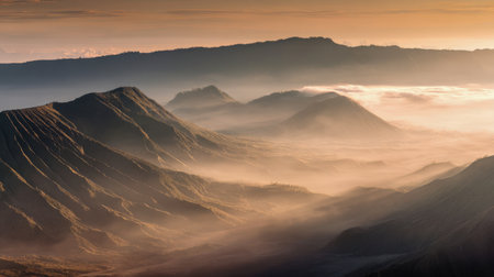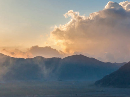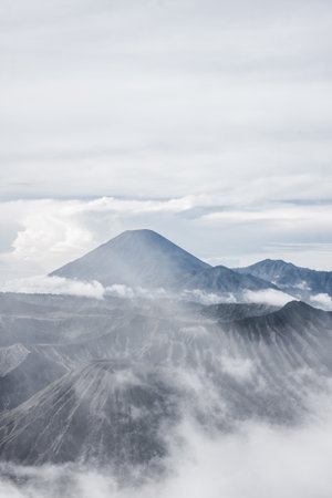 Thick mist and fog Around the Mountains of Volcano Bromo