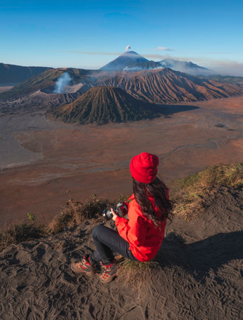 An Asian girl standing on a hill track in Bromo, enjoying view of Bromo, a wonderful scenery in dramatic hill
