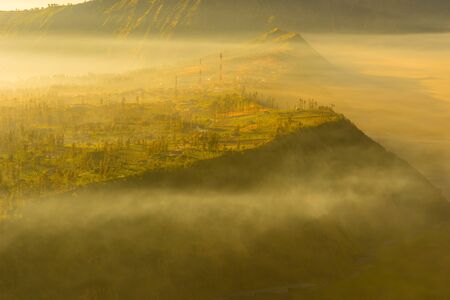 Beautiful Sunriser at Village next to volcano Bromo at sunrise time background, Cemoro lawang village at mount Bromo in Bromo tengger semeru national park, East Java, Indonesia.