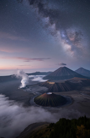 Million Stars with wonderful sky at sunrise over Mount. Bromo at Bromo Tengger Semeru National Park, East Java, Indonesia Milky way and stars above Mount Bromo volcano at night. Sunrise at Mt. Bromo.