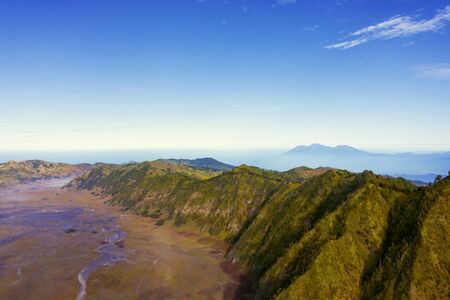 Beautiful aerial view of Kingkong hill under blue sky at misty morning in East Java, Indonesia