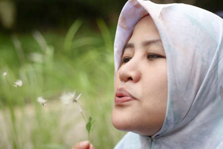 Close up portrait of happy Asian muslim woman wearing hijab in the meadow blows on dandelion