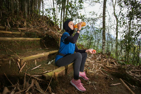 Asian muslim woman drinking water after jogging,healty and sport concept.
