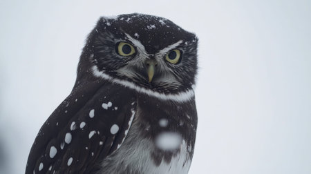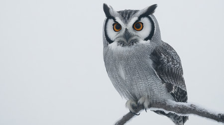 A stunning close-up of a magnificent owl perched elegantly on a snow-laden branch, its bright eyes capturing the essence of winter's beauty and tranquility.