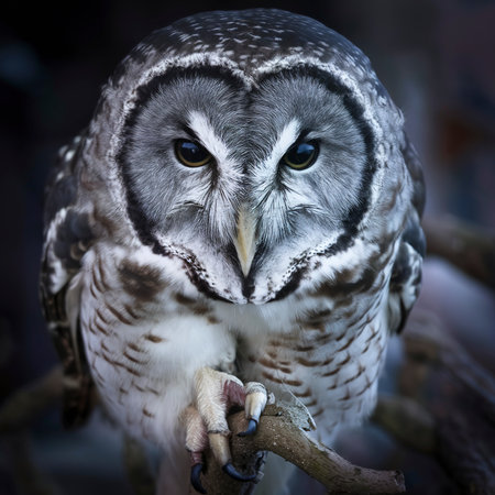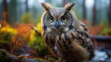 Wild owl with sharp gaze looking straight into the camera. Creating using generative AI tools