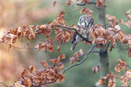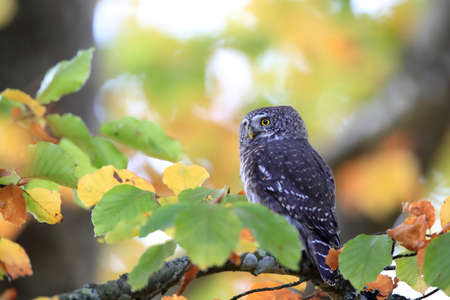 Owl hidden in the orange leaves. Bird with big yellow eyes. Autumn bird. Boreal owl in the orange leave autumn forest in central Europe. Detail portrait of bird in the nature habitat, Germany.