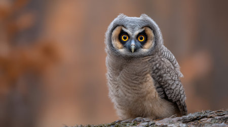 This enchanting close-up image features a fluffy young owl with captivating yellow eyes resting on a tree trunk, immersed in the tranquil beauty of an autumn forest.