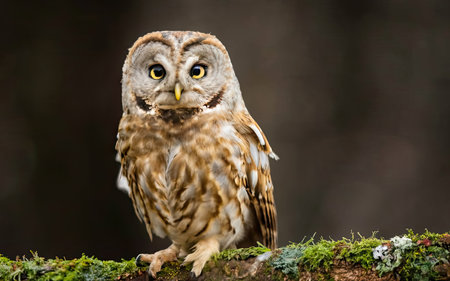 an owl is sitting on a mossy branch in the dark forest, looking at the camera with a serious look on its face and eyes. .