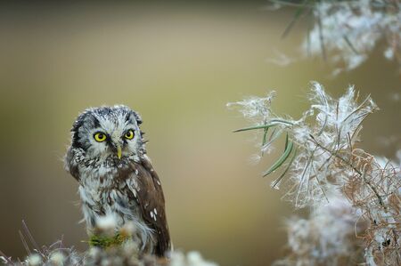 Close-up portrait of tiny brown owl with shining yellow eyes and a yellow beak in a beautiful natural environment. Boreal Owl also known as Tengmalm's Owl or Richardson's Owl, Aegolius funereus.
