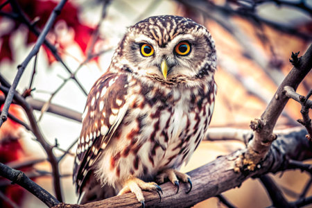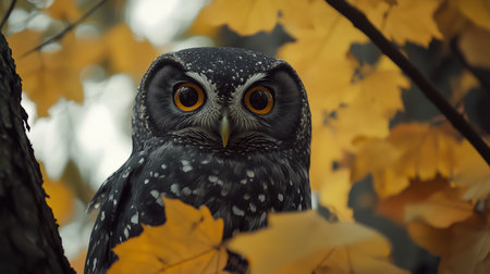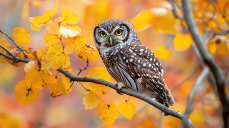 A small spotted owl with bright yellow eyes sits on a branch amidst vibrant autumn leaves. The scene showcases the beauty of nature in a forest setting
