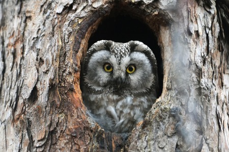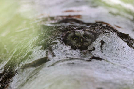 Little Owl peeping out of the hollow of an old tree. A spotted owlet in the tree nest hole.