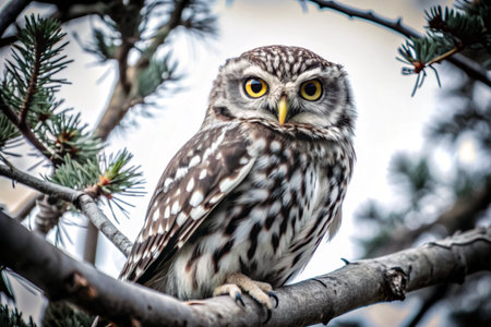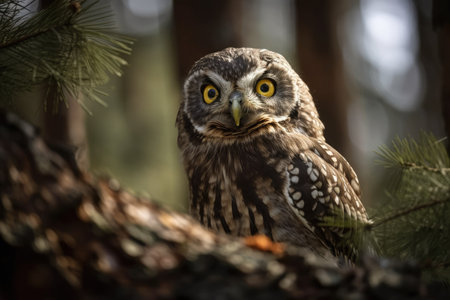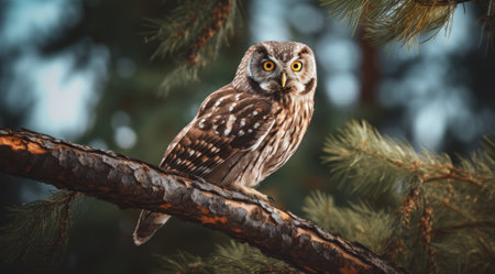 A shy Boreal owl rests quietly among spruce branches. This elusive nocturnal hunter inhabits mountain forests and is rarely seen during the day.