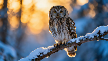 Brown and white patterned Ural Owl observed against a powerful golden hour backlight, resting on a frost-covered branch, highlighting the stark contrast between warm sunlight and cold blue winter...