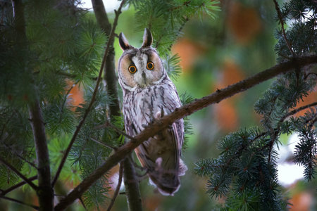 Long-eared owl Asio otus resting on the branch in Zoo Park. Sharp photograph with shallow depth of field.