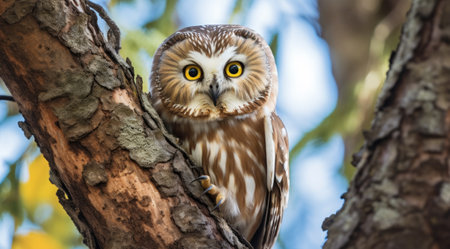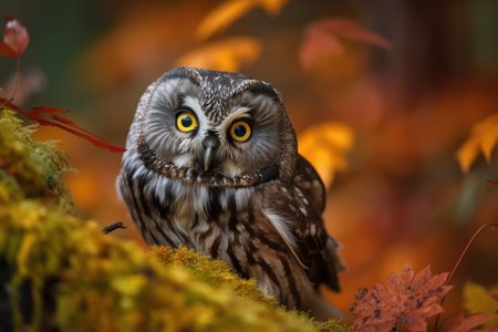 Boreal owl, Aegolius funereus, detail portrait in the natural environment, Czech Republic, amid the orange larch autumn woodland. In the jungle, there was a lovely tiny bird. Generative AI