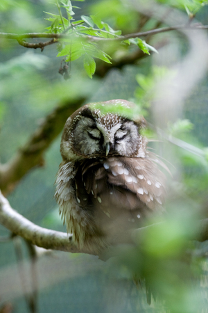 Owl in a cage at the Tallinn Zoo in winter. Estonia