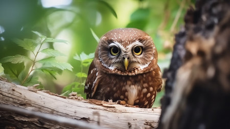 This enchanting close-up captures an adorable owl perched gracefully on a branch, surrounded by vibrant green leaves and gentle sunlight, creating an inviting, serene atmosphere.